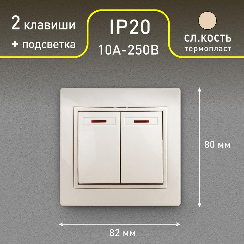 Характеристики Выключатель Intro Plano 1-105-02 двухклавишный с подсветкой, 10А-250В, IP20, СУ, слоновая кость: