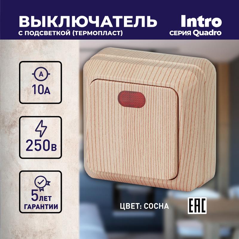 Характеристики Выключатель Intro Quadro 2-102-11 одноклавишный с подсветкой, 10А-250В, IP20, ОУ, сосна: