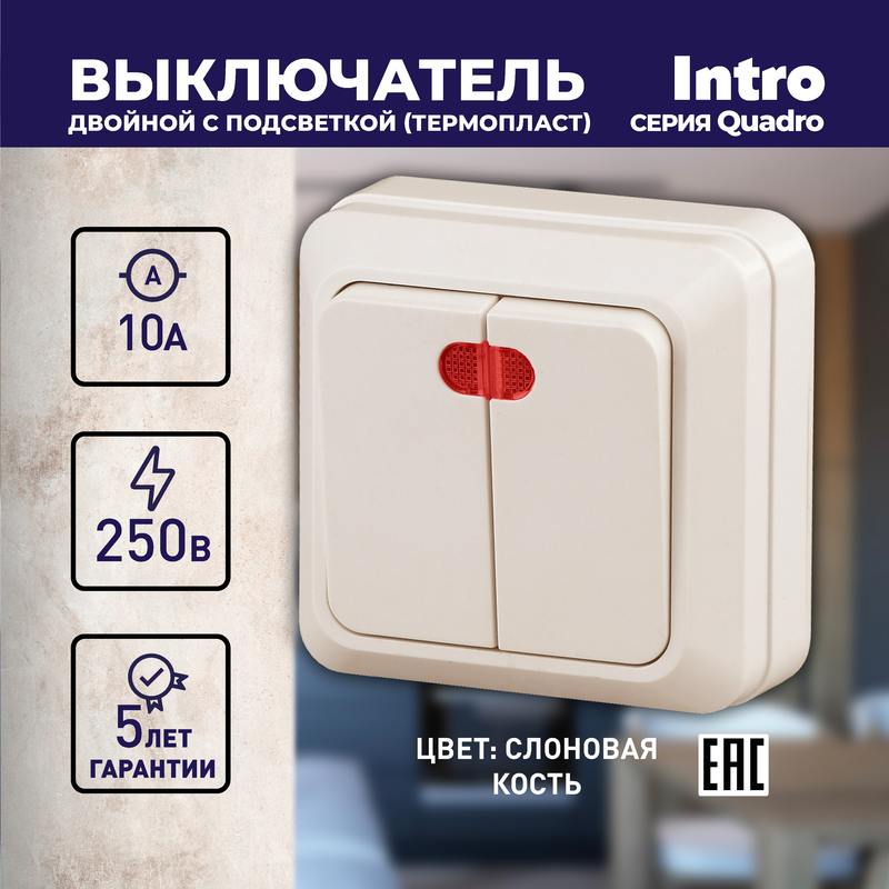 Характеристики Выключатель Intro Quadro 2-105-02 двухклавишный с подсветкой, 10А-250В, IP20, ОУ, слоновая кость:
