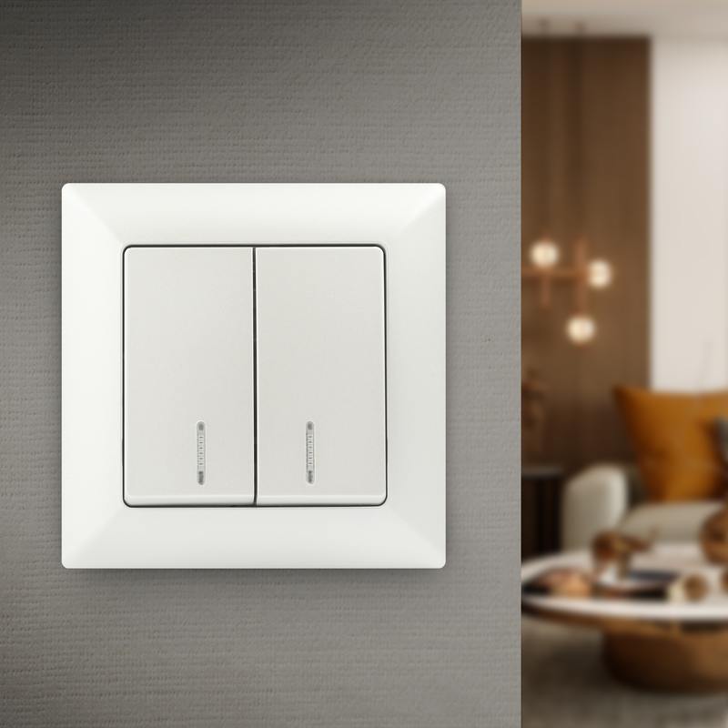 Характеристики Выключатель Intro Solo 4-105-06 двухклавишный с подсветкой, 10А-250В, IP20, СУ, перламутр: