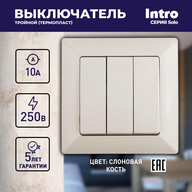 Характеристики Выключатель Intro Solo 4-106-02 трехклавишный 10А-250В, IP20, СУ, слоновая кость: