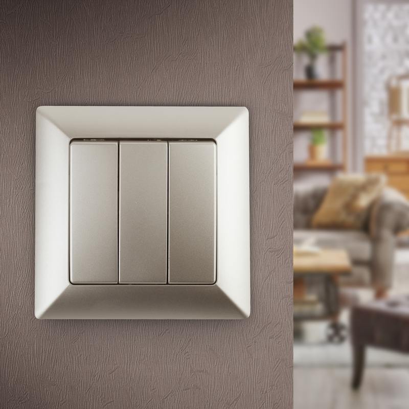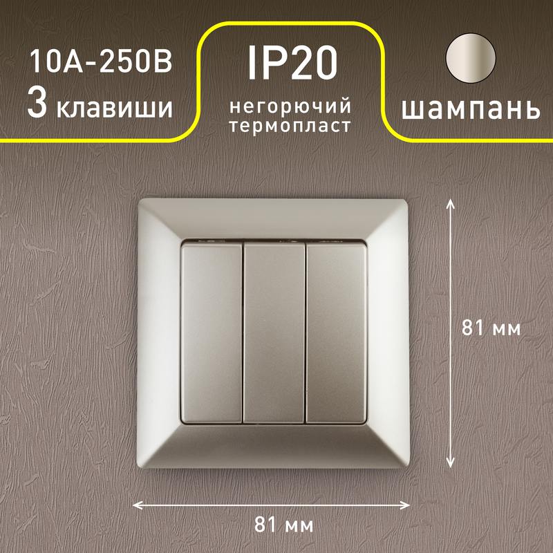 Характеристики Выключатель Intro Solo 4-106-04 трехклавишный 10А-250В, IP20, СУ, шампань: