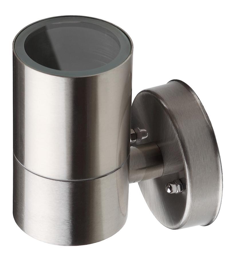 Светильник декоративный настенный WL15 создает интересные световые композиции, подчеркивает структуру материалов. Подходит для наружного уличного освещения и влажных помещений. Цоколь для источника света GU10, напряжение питания 220В ~50/60Гц, материал нержавеющая сталь/стекло, цвет светильника хром, размер 92*110*77 мм, D60 мм, максимальная мощность лампы 50 Вт, степень защиты IP44