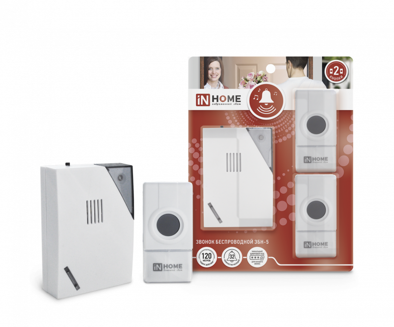 Характеристики Звонок беспроводной ЗБН-5 32 мелодии 120м с цифровым кодированием с двумя кнопками IP44 БЕЛО-СЕРЫЙ IN HOME: