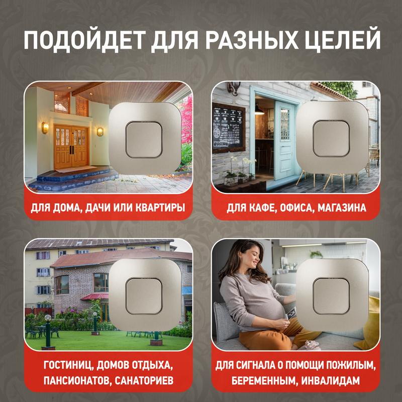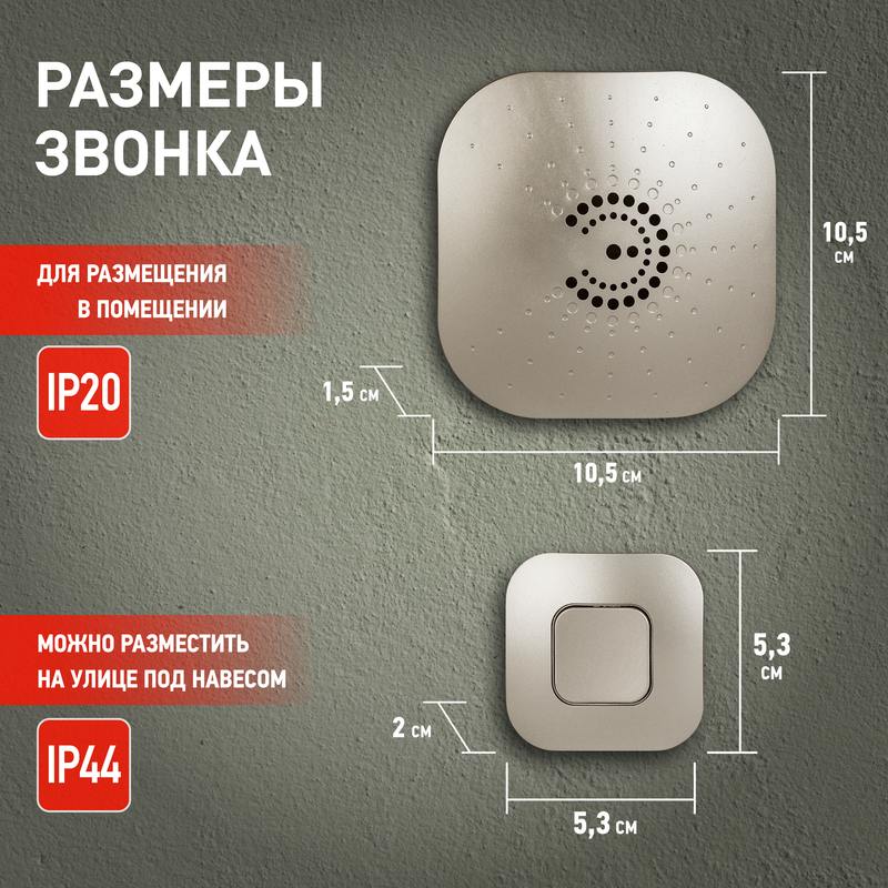 Беспроводной звонок цвета шампань разработан в России дизайн-центром ЭРА. Подходит для любых помещений — квартир, домов, загородных участков. К одной кнопке можно подключить много динамиков и наоборот — к одному динамику несколько кнопок. Их можно объединить и в общую сеть, если у вас несколько калиток и строений на одном участке: все кнопки подключаются ко всем динамикам. Радиус действия достигает 100 метров. Идеален для дачи — быстрая установка, кнопки защищены от влаги и пыли (IP44), динамик — IP 20. Звонок не зависит от наличия электроэнергии, он работает от батареек: динамик от 2 штук АА (в комплект не входят), кнопка — от СR2032 (в комплекте). Дополнительный бонус электрозвонка ЭРА BIONIC после его установки не нужно ломать голову, куда спрятать провода.