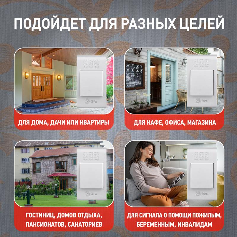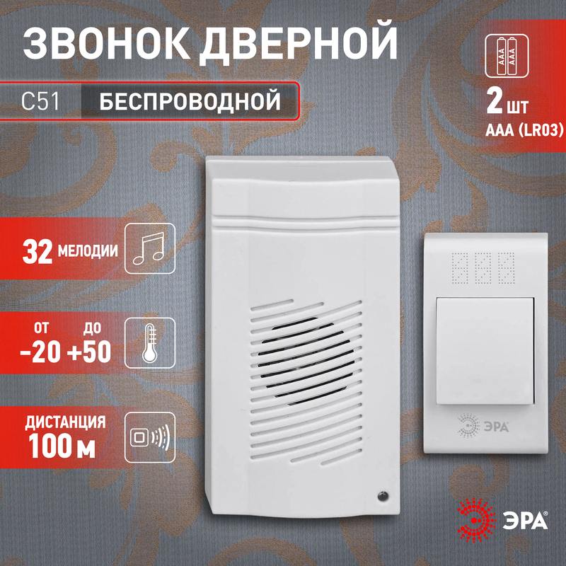 Характеристики Звонок дверной ЭРА C51 беспроводной белый 32 мелодии: