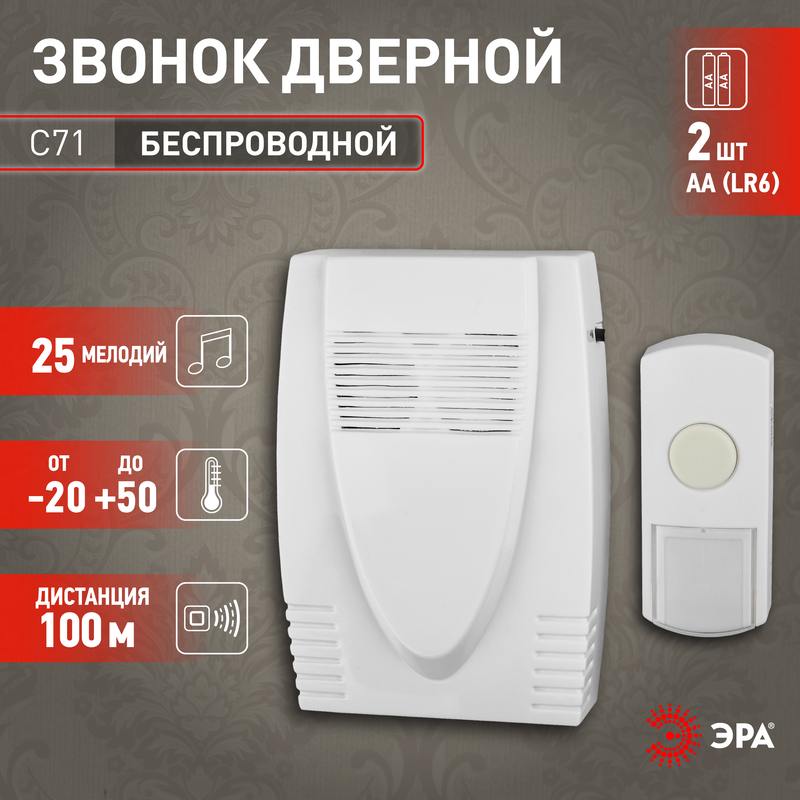 Характеристики Звонок дверной ЭРА C71 беспроводной белый 25 мелодий: