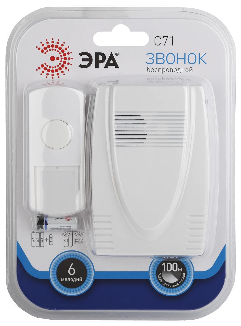 Беспроводной электрический дверной звонок с 6 качественными мелодиями и влагозащищённой кнопкой. Прост в подключении. Отсутствие проводов позволяет использовать звонок с максимальным удобством. Динамик можно разместить в коридоре или взять с собой в комнату/на кухню, если не хотите разбудить домочадцев. Беспроводные звонки ЭРА хороши для дачи или загородного дома установите кнопку на дверной калитке, а динамик в помещении. Радиус действия — до 100 метров. Звонок работает от батареек: 1 шт А23 для кнопки (входит в комплект), 2 шт АА пальчиковые для динамика (в комплект не входят). При среднем использовании (до 20 звонков в день) исправно проработает без замены элементов питания не менее года. Блистерная упаковка.