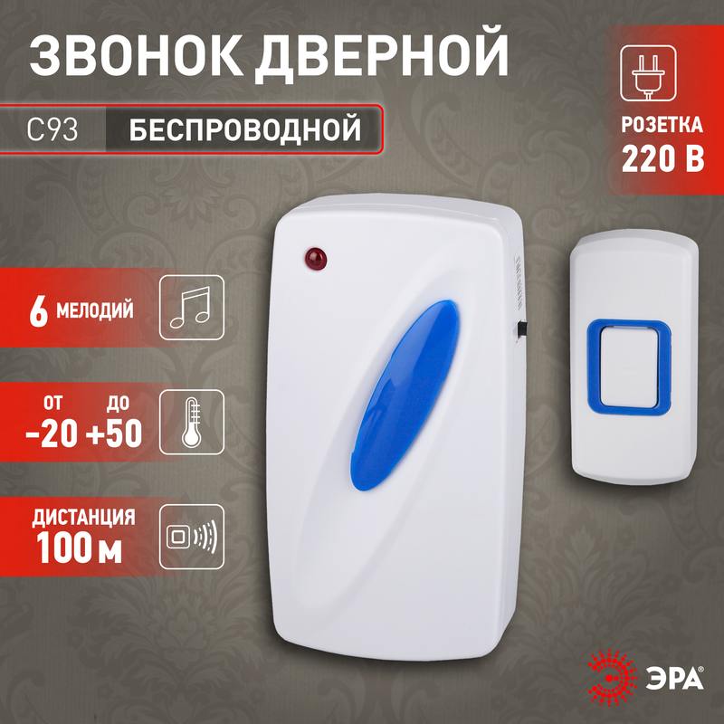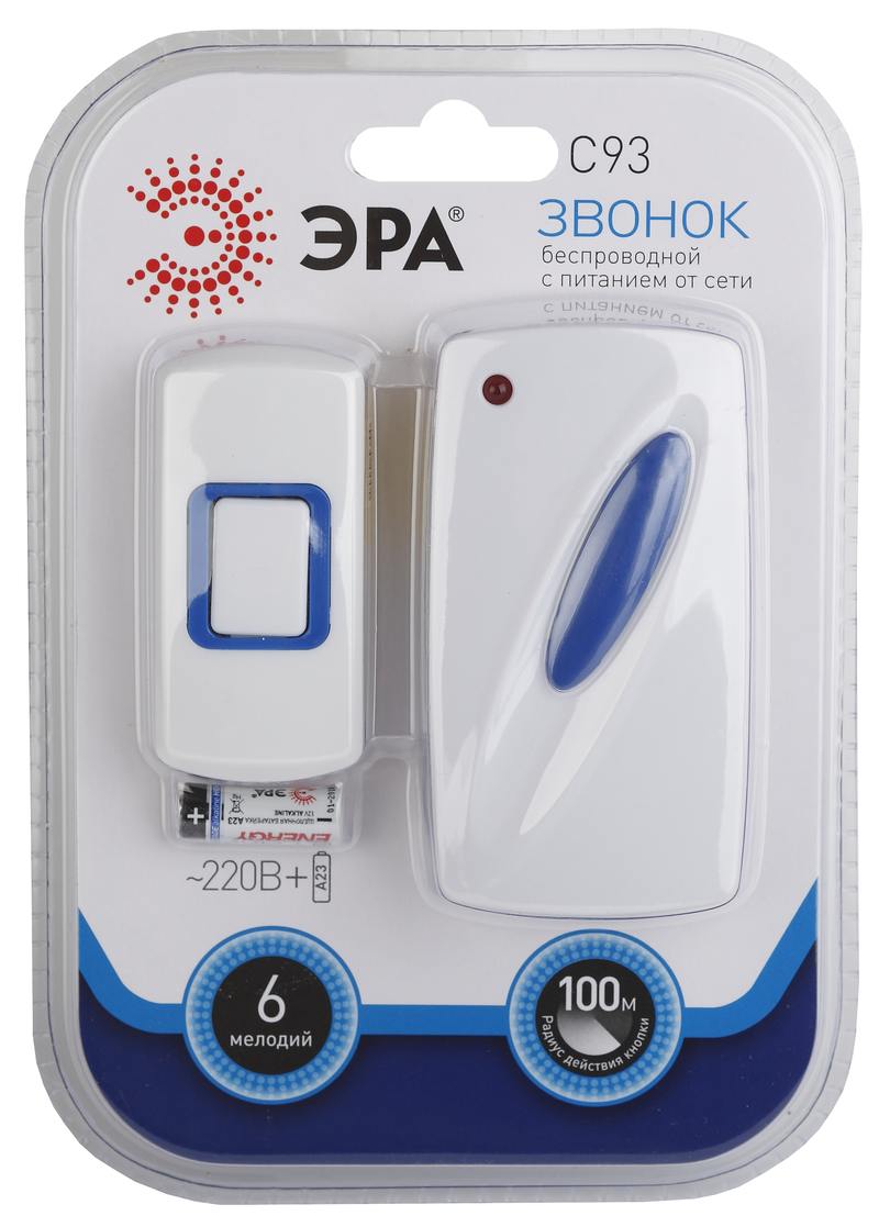 Характеристики Звонок дверной ЭРА C93 беспроводной от сети белый с синим 6 мелодий: