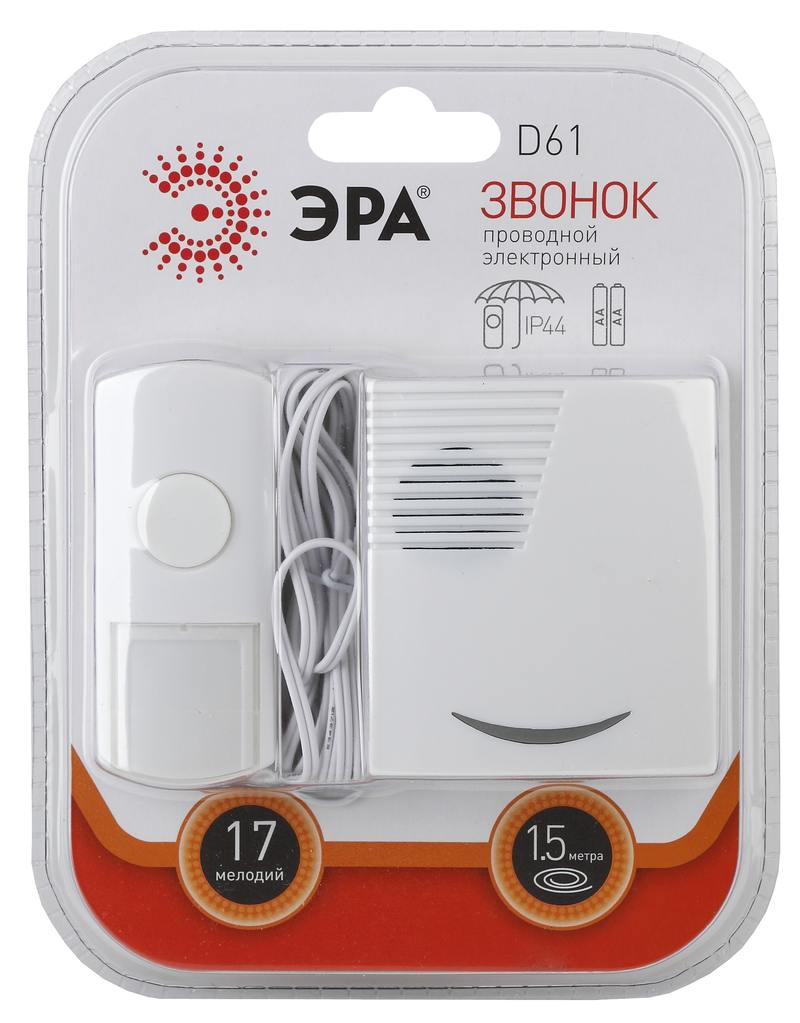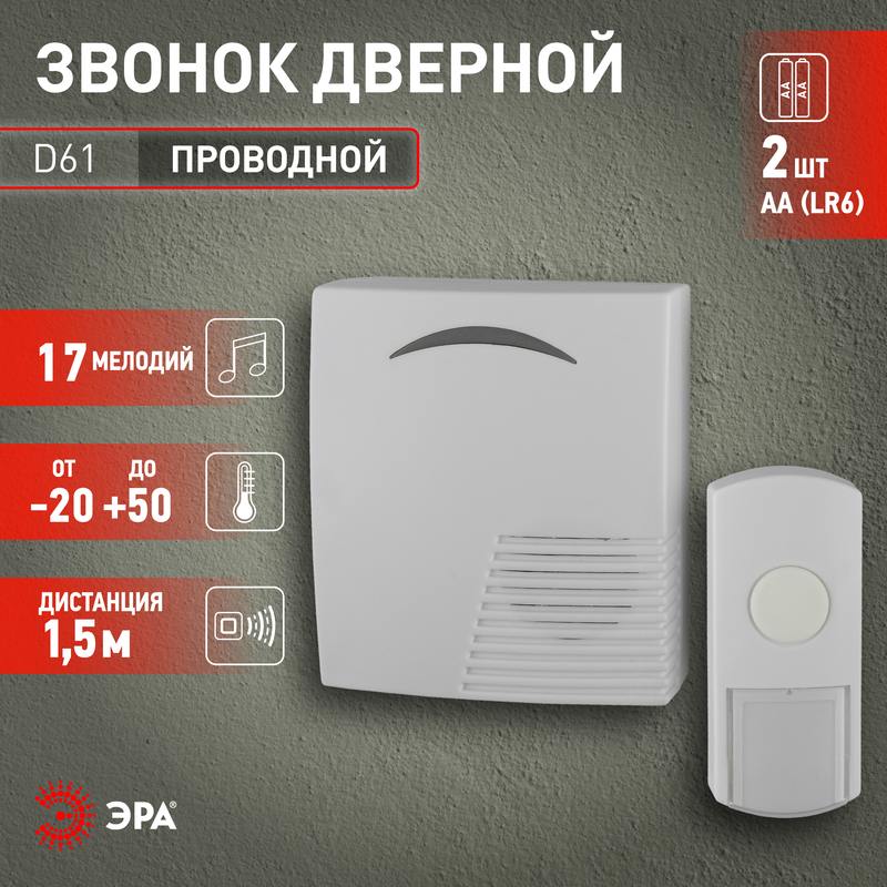 Характеристики Звонок дверной ЭРА D61 проводной белый 17 мелодий: