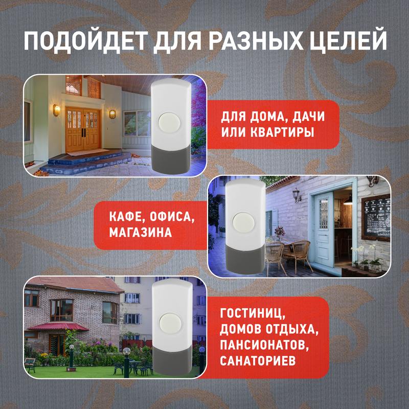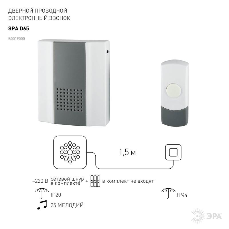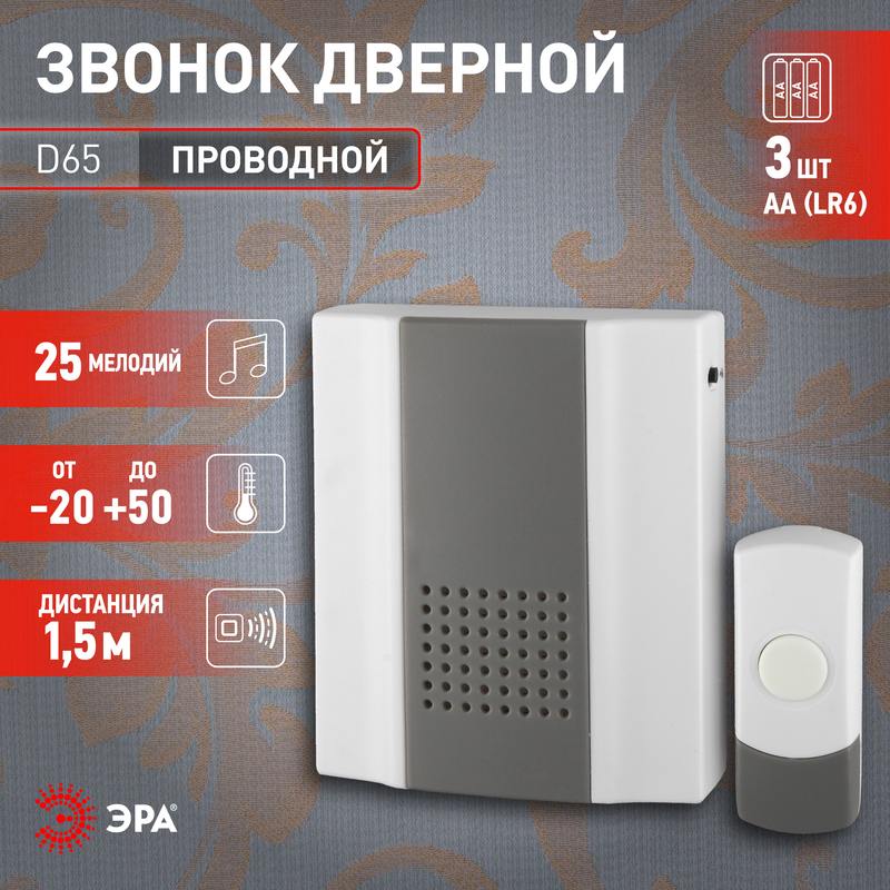 Характеристики Звонок дверной ЭРА D65 проводной белый с серым 25 мелодий: