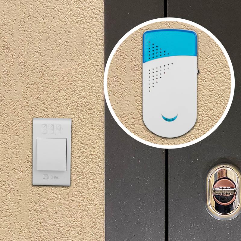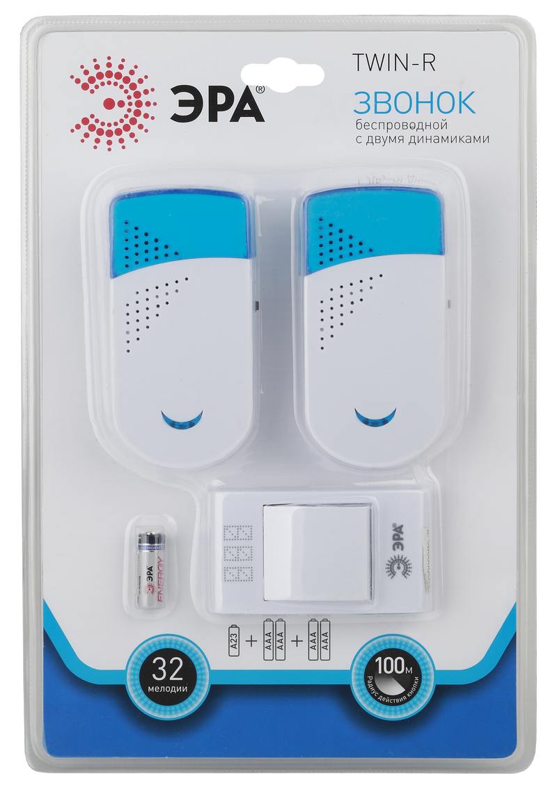 TWIN-R ЭРА — дверной беспроводной электронный звонок с двумя динамиками, которые можно установить в разных комнатах. Идеальное решение для больших квартир, частных домов. Радиус действия 100 метров. 32 мелодии вы можете чередовать в зависимости от настроения. Звук такого звонка никогда не надоест. Работает от батареек: 1 шт А23 для кнопки (входят в комплект), по 2 шт ААА мизинчиковые для каждого динамика (в комплект не входят). Аккуратный лаконичный дизайн. Над кнопкой предусмотрено пространство для указания номера квартиры.